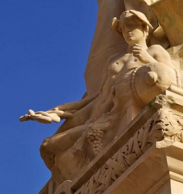 Au-dessus des « fleuves », l’on trouve quatre groupes de Paul Gasq. Sur le premier, face à la gare l’on voit la Ville de Reims, et le Commerce symbolisé par Mercure et son casque ailé, sur les autres côtés la Vigne, puis l’Agriculture représentée par un berger et enfin le Travail évoqué par un forgeron. La colonne ornée de feuilles de vigne et de grappes de raisins dues au ciseau de Charles Wary est surmontée d’une Renommée en bronze due à Auban