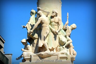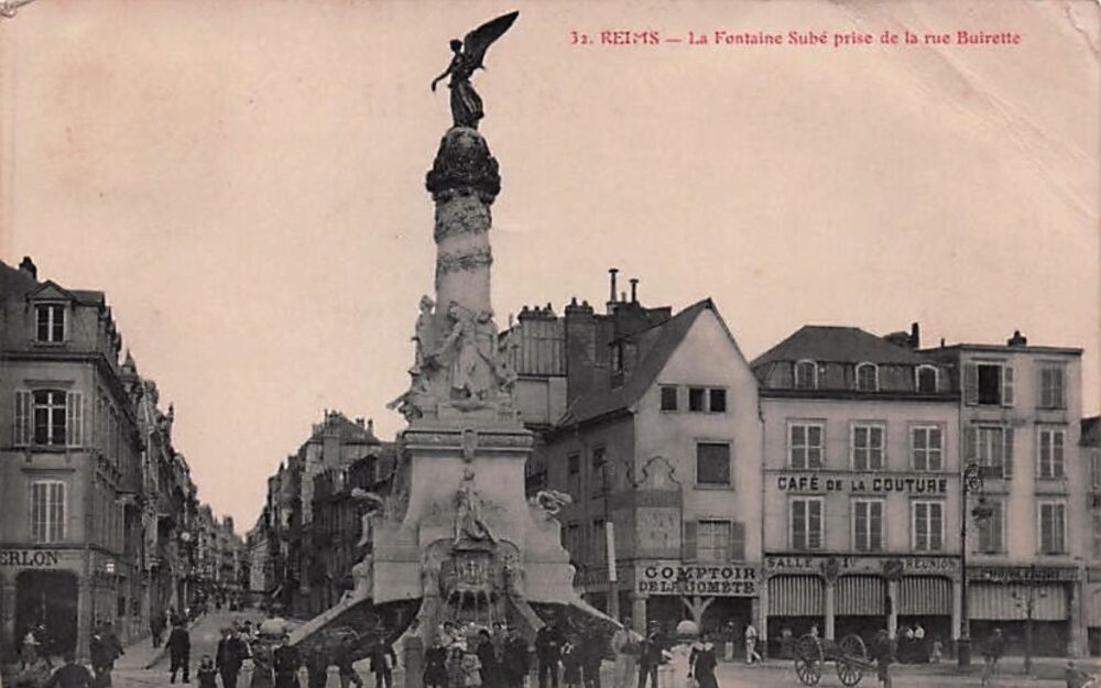 La fontaine présente à sa base les quatre « fleuves » régionaux : la Vesle et l’Aisne dues au sculpteur Auban, la Marne et la Suippes (sic) dues à Baralis. En dévoilant la sculpture on va s’apercevoir que le sculpteur a effectivement ajouté un « S » final à l’une des quatre rivières indigènes.